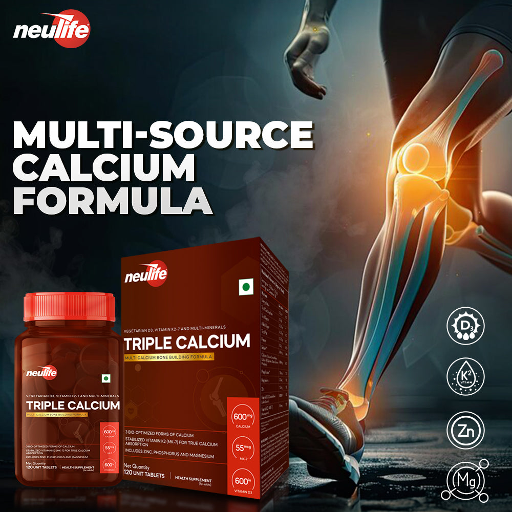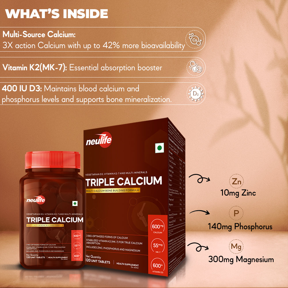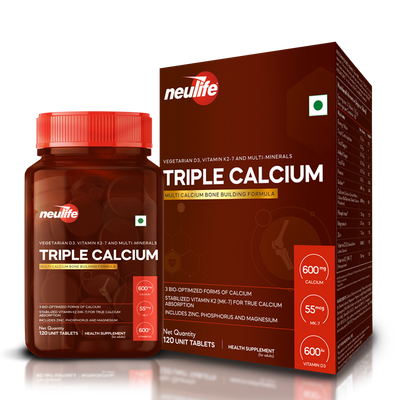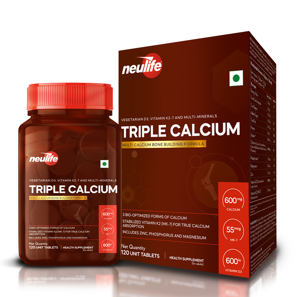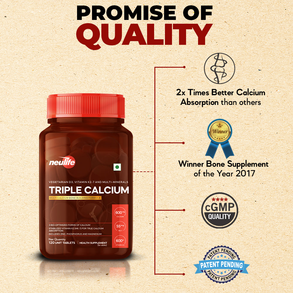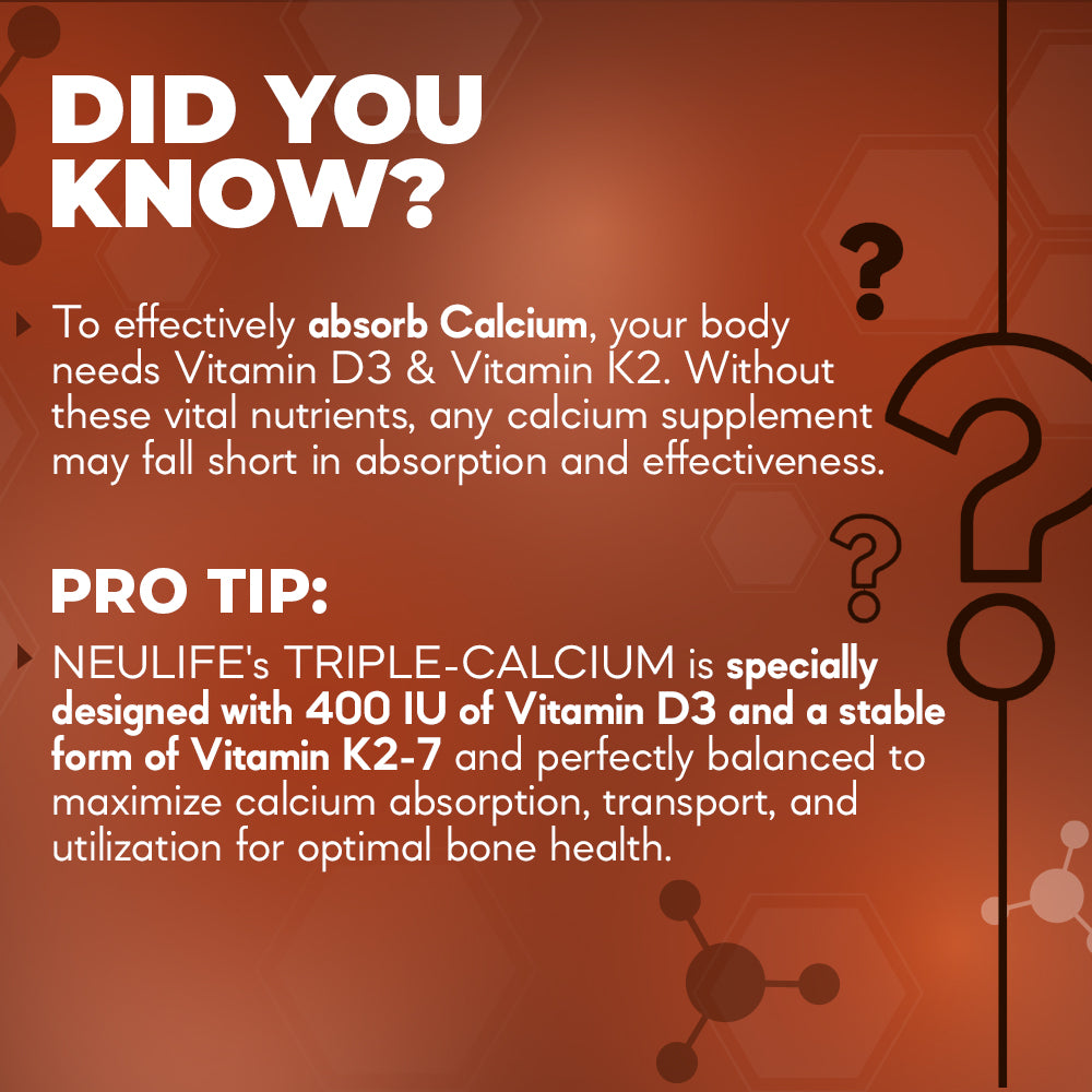 Triple-Calcium uses for the first time, a highly stable microencapsulated form of Vitamin K2 (MK-7) along with Vegetarian D3 (from lichens) to ensure Complete Calcium Absorption.