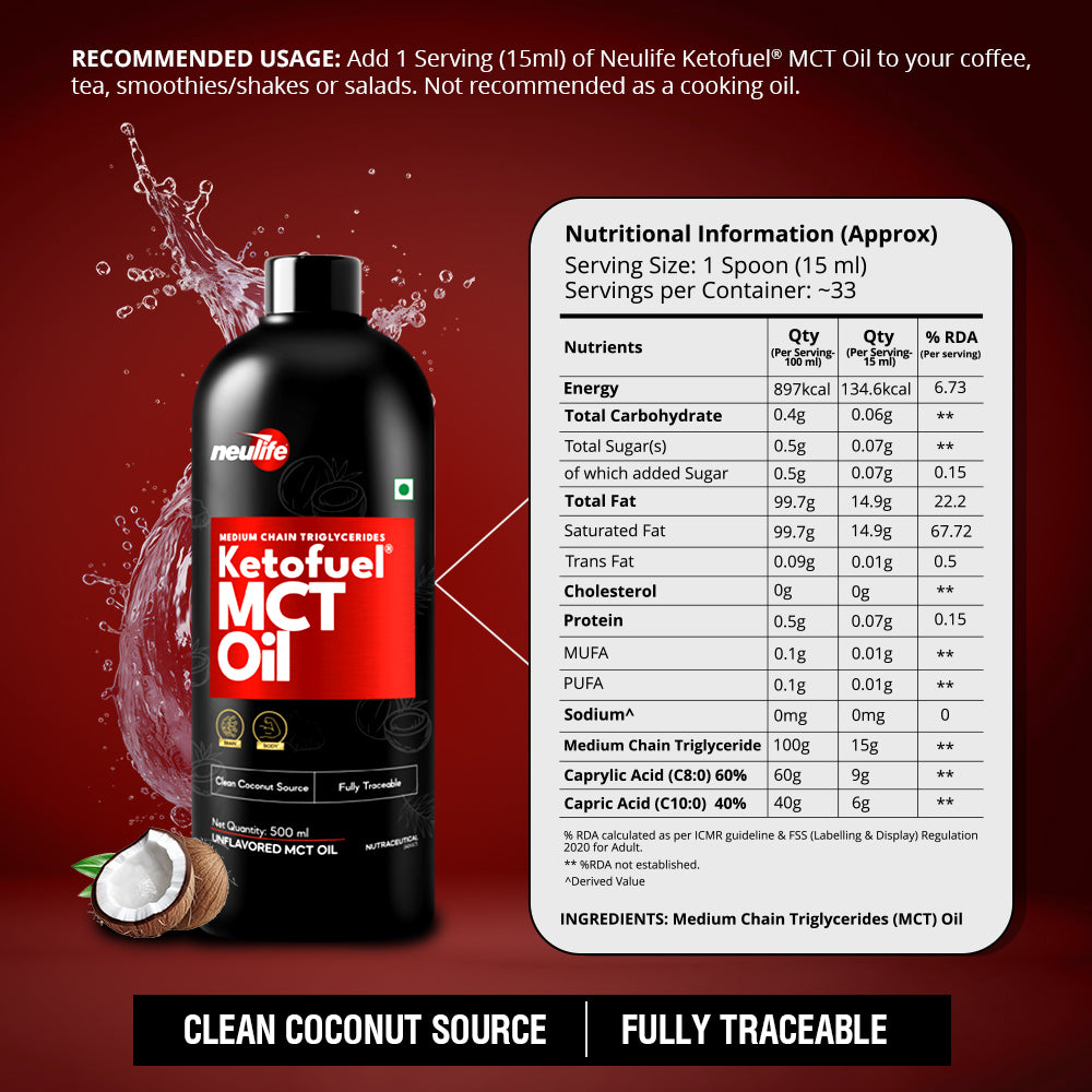 Neulife’s Ketofuel® MCT Oil is the same oil used in our U.S. Patented Ketofuel MCT Powder and comes from a fully traceable, environment-friendly, native Coconut source.