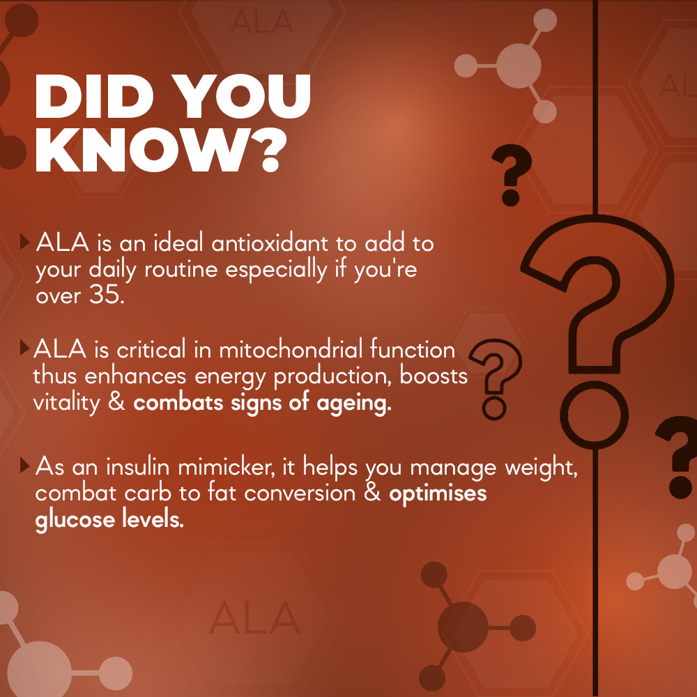 GLUCOSE MANAGEMENT: ALA enhances glucose metabolism, allowing the body to manage carbohydrates efficiently, supporting optimal energy use and helping regulate blood sugar levels.