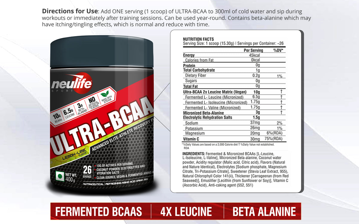 • Complete intra-training solution:10g BCAAs to help recovery and fuel endurance, 6.5g of L-Leucine to ignite protein synthesis and 3.0g Beta-alanine per serving to buffer lactic acid and improve muscle-pH.