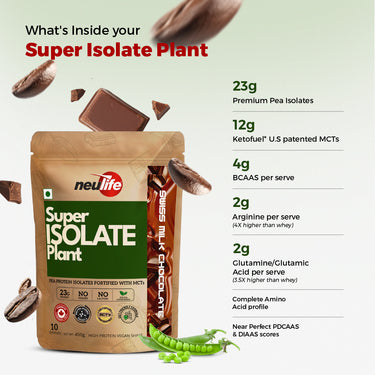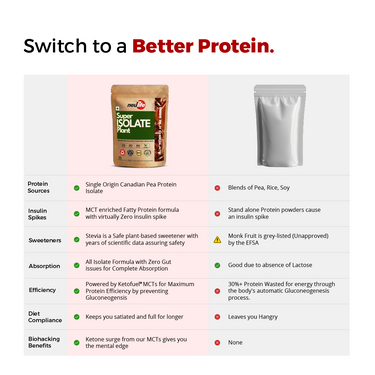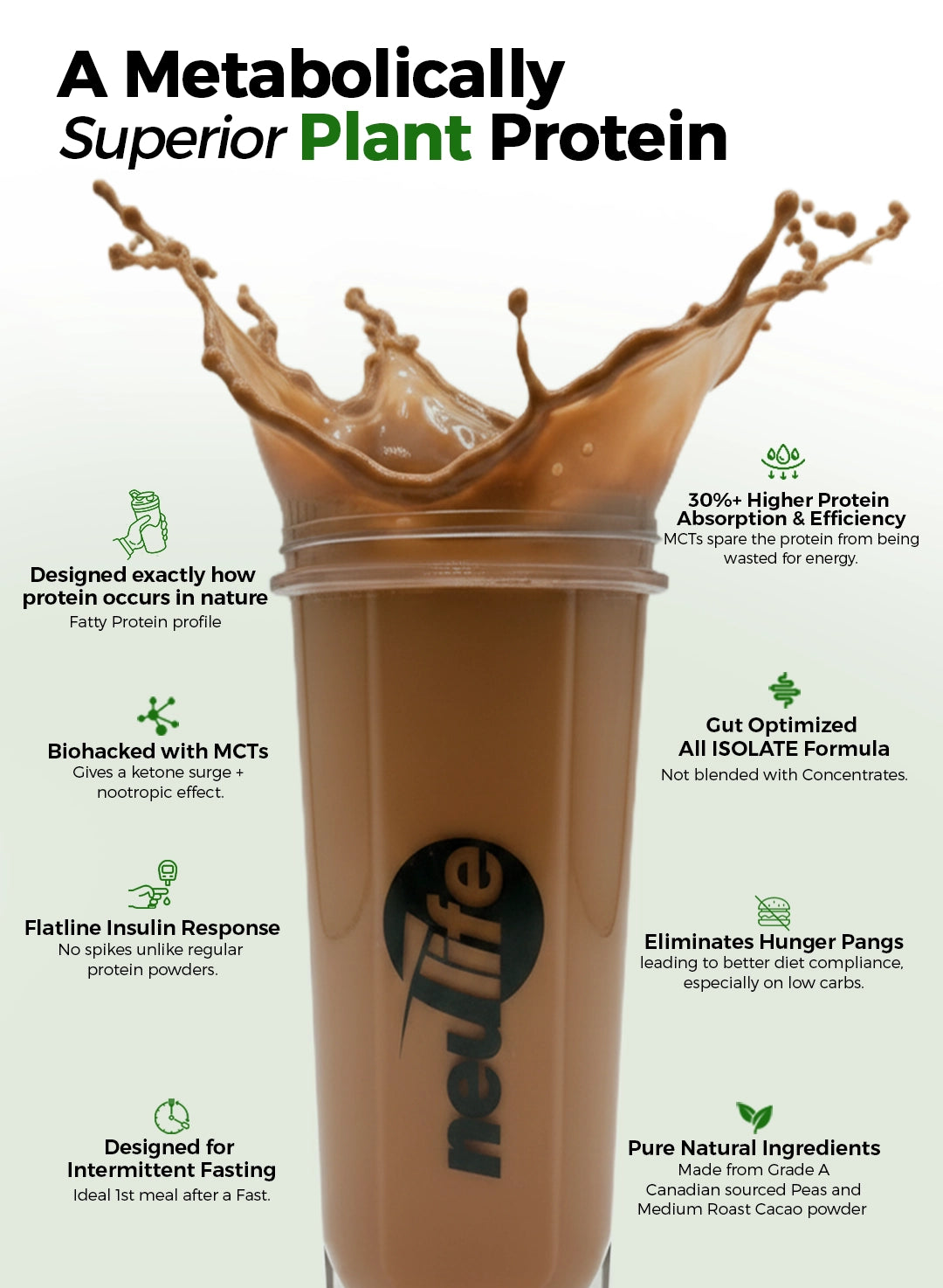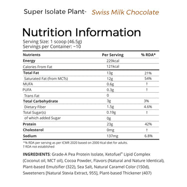 SUPER ISOLATE PLANT was specifically designed to support Low-Carb-High-Protein (LCHP) Diets. During LCHP diets, the biggest pain point is hunger pangs and low energy. SUPER ISOLATE PLANT solves this problem with its Gut friendly, MCT Super-fats enriched formula (U.S Patented Ketofuel® MCTs), which provides a rich source of fuel for body and mind. No more hunger pangs, 100% diet compliance!