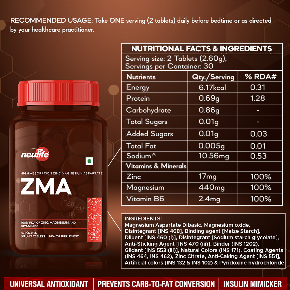 ZMA plays a crucial role in cellular, hormonal and nervous system health. Neulife's ZMA uses highly bioavailable sources of Zinc, Magnesium and Vitamin B6 in 100% RDAs to support natural sleep and recovery.